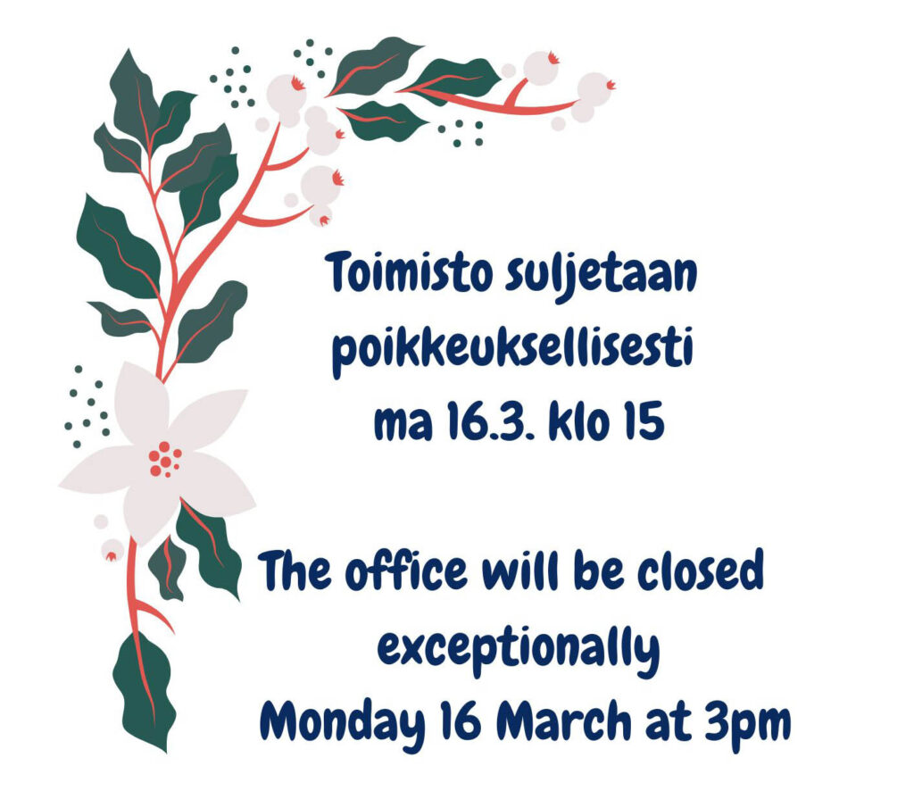Toimisto suljetaan poikkeuksellisesti ma 16.3. klo 15
